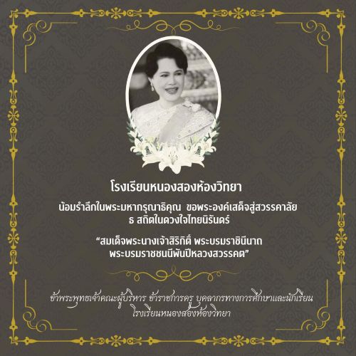 ธ สถิตในดวงใจ ตราบนิจนิรันดร์ สมเด็จพระนางเจ้าสิริกิติ์ พระบรมราชินีนาถพระบรมราชชนนีพันปีหลวง ด้วยสำนึกในพระมหากรุณาธิคุณเป็นล้นพ้นอันหาที่สุดมิได้ ข้าพระพุทธเจ้า คณะผู้บริหาร คุณครูและนักเรียนโรงเรียนหนองสองห้องวิทยา